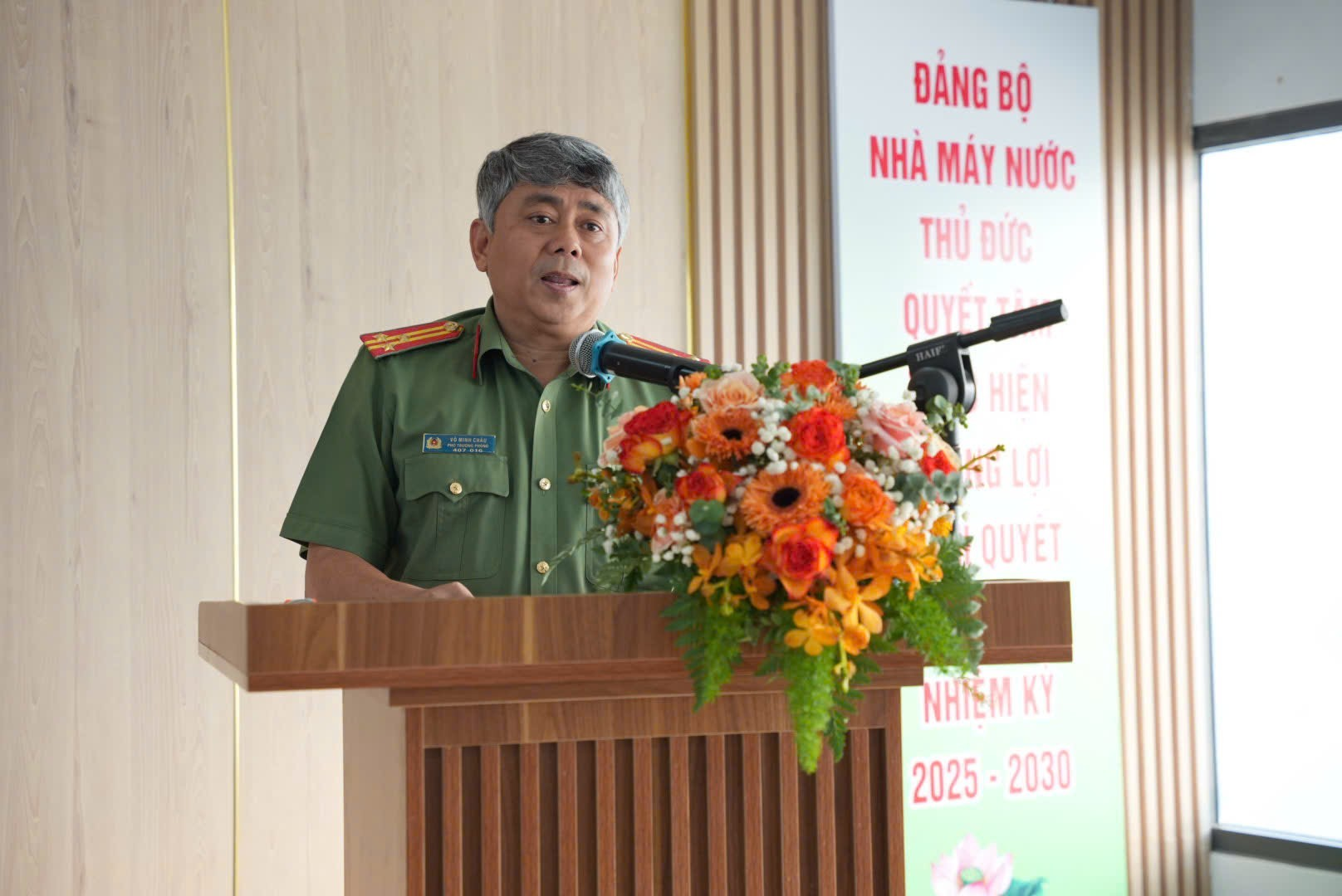 Đồng chí Thượng tá Võ Minh Châu – Phó Trưởng Phòng An ninh Kinh tế - đại diện lãnh đạo Phòng an ninh kinh tế phát biểu ý kiến trước Hội nghị giúp Nhà máy duy trì phong trào ngày càng tốt hơn trong tương lai.